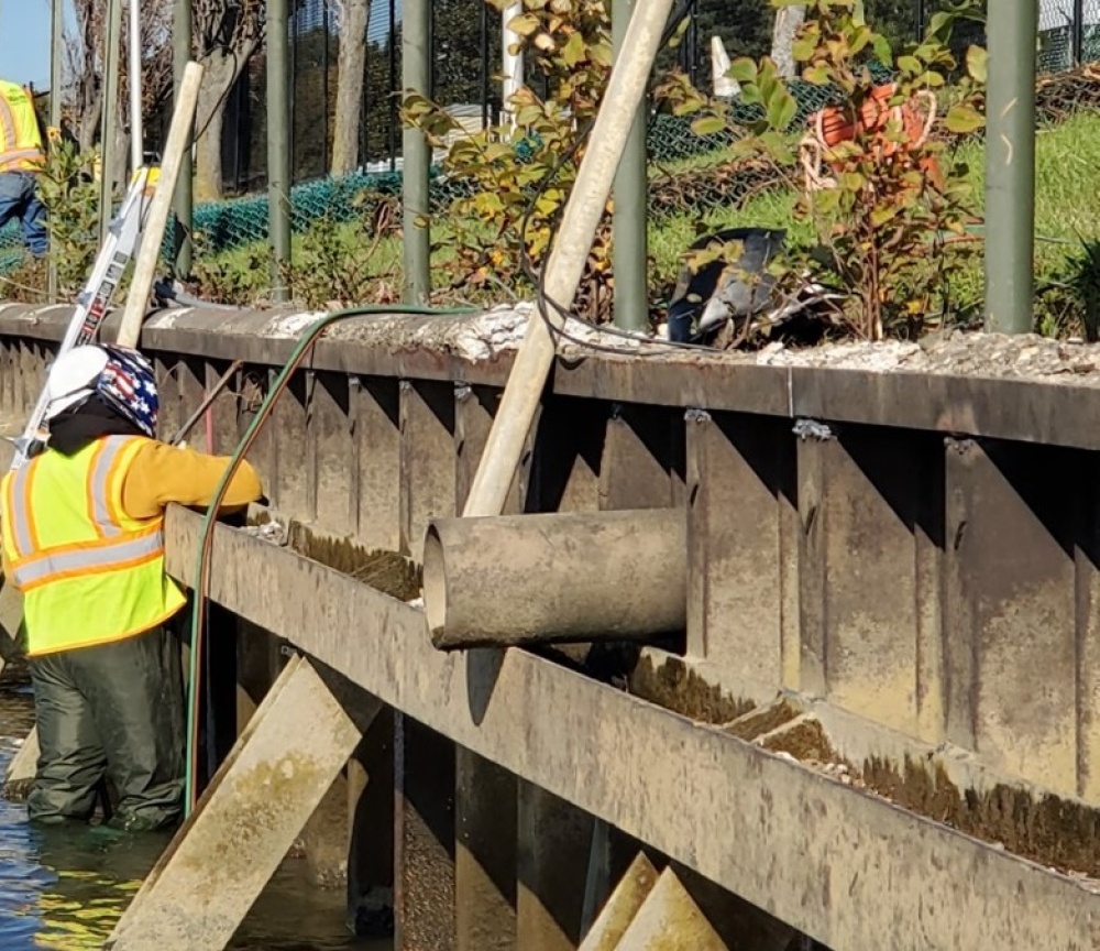 A Research Laboratory in Washington, DC has an existing steel sheet pile bulkhead wall that was built in the 1980’s. The bulkhead consists of 3,200 LF of steel sheet pile with W8x40 battered pile buttresses on the waterside that are welded to a W10x39 wale, which is periodically submerged at high tide. The bulkhead is downstream from the Anacostia River and is mostly fresh water. Salinity fluctuates based on river flow, with the normal water resistivity ranging from 1200 to 3600 ohm-cm. The existing wall was not coated and had begun to perforate at the mudline and near the cap.